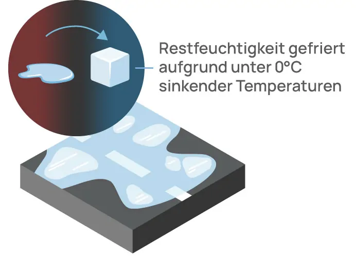 Rasch abfallende Temperaturen können für eine zügige Eisbildung sorgen. Dieser Prozess dauert meist einige Stunden. Gefrieren von Restnässe entsteht daher nicht so schnell wie am Boden gefrierender Regen.